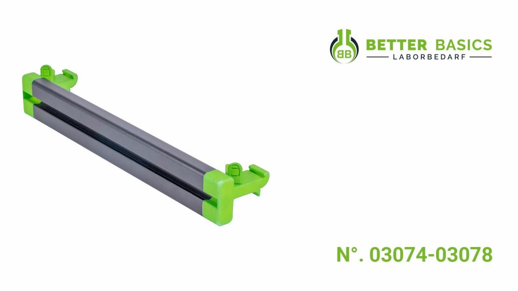 Die SmartRail MB 001 ist speziell für den Einsatz an Labormöbeln mit Standardstativsystemen von 12 mm oder 13 mm entwickelt worden. Die Konstruktion besteht aus einer schwarz eloxierten Aluminiumnutschiene und seitlichen Halterungen aus PA12 und Edelstahl, die mit einer stabilen Schraubklemmung ausgestattet sind, um eine stabile Montage am Stativsystem zu gewährleisten. Die vielseitige SmartRail ermöglicht flexible Platzierungsmöglichkeiten im Labor. Eine größere Anzahl an SmartRail bietet vielfältige Optionen zur Modulplatzierung und ermöglicht die individuelle Anpassung der Laborumgebung an spezifische Anforderungen. Alle Module sind vollständig mit der SmartRail kompatibel. Die SmartRail MB 001 kann an Stativaufbauten sowohl im Abzug als auch auf der Werkbank verwendet werden.